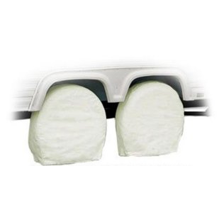 CLASSIC ACCESSORIES RV WHEEL COVERS, WHITE, SET OF 2 — 24-26.5 in. diameter; With elastic hem that holds wheel covers securely; Made from water-repellent heavy-duty vinyl with soft, no-scratch backing; Keeps wheels clean while protecting them against sun damage, weather, and other elements; Easily slips on; Folds up for compact storage; Easy to clean.