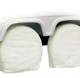 CLASSIC ACCESSORIES RV WHEEL COVERS, WHITE, SET OF 2 — 26.75-28.75 in. diameter; With elastic hem that holds wheel covers securely; Made from water-repellent heavy-duty vinyl with soft, no-scratch backing; Keeps wheels clean while protecting them against sun damage, weather, and other elements; Easily slips on; Folds up for compact storage; Easy to clean.