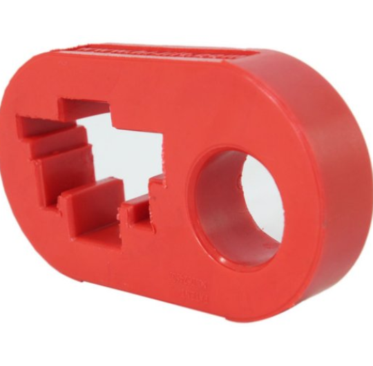 HI-LIFT HANDLE-KEEPER, RED — A Rugged Polyurethane Handle-Keeper That Holds The Hi-Lift Handle To The Upright Steel Bar, Keeps The High-Lift Handle In Place When Not In Use And Eliminates Its Rattling During Transportation And Storage, Can Be Easily Slipped On And Off Over The Hi-Lift Top Clamp-Clevis To Allow The Proper Use Of Hi-Lift Jack, Features A Unique Design That Eliminates The Need To Remove The Top Clamp-Clevis, Must Be Removed During The Use Of Jack To Allow The Handle To Be In Its Full Upright Position
